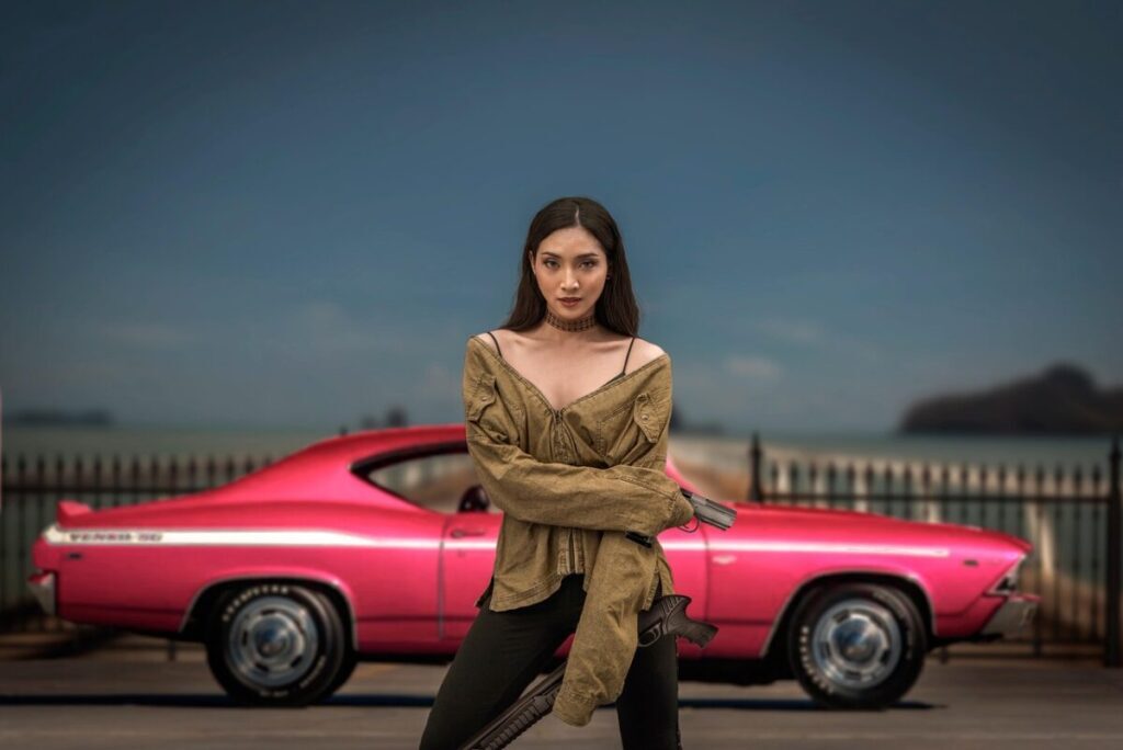 Prompt: “Wanita mafia bersandar pada mobil antik hitam, malam hari, cahaya lampu jalan keemasan, gaya mewah ultra-realistis.”